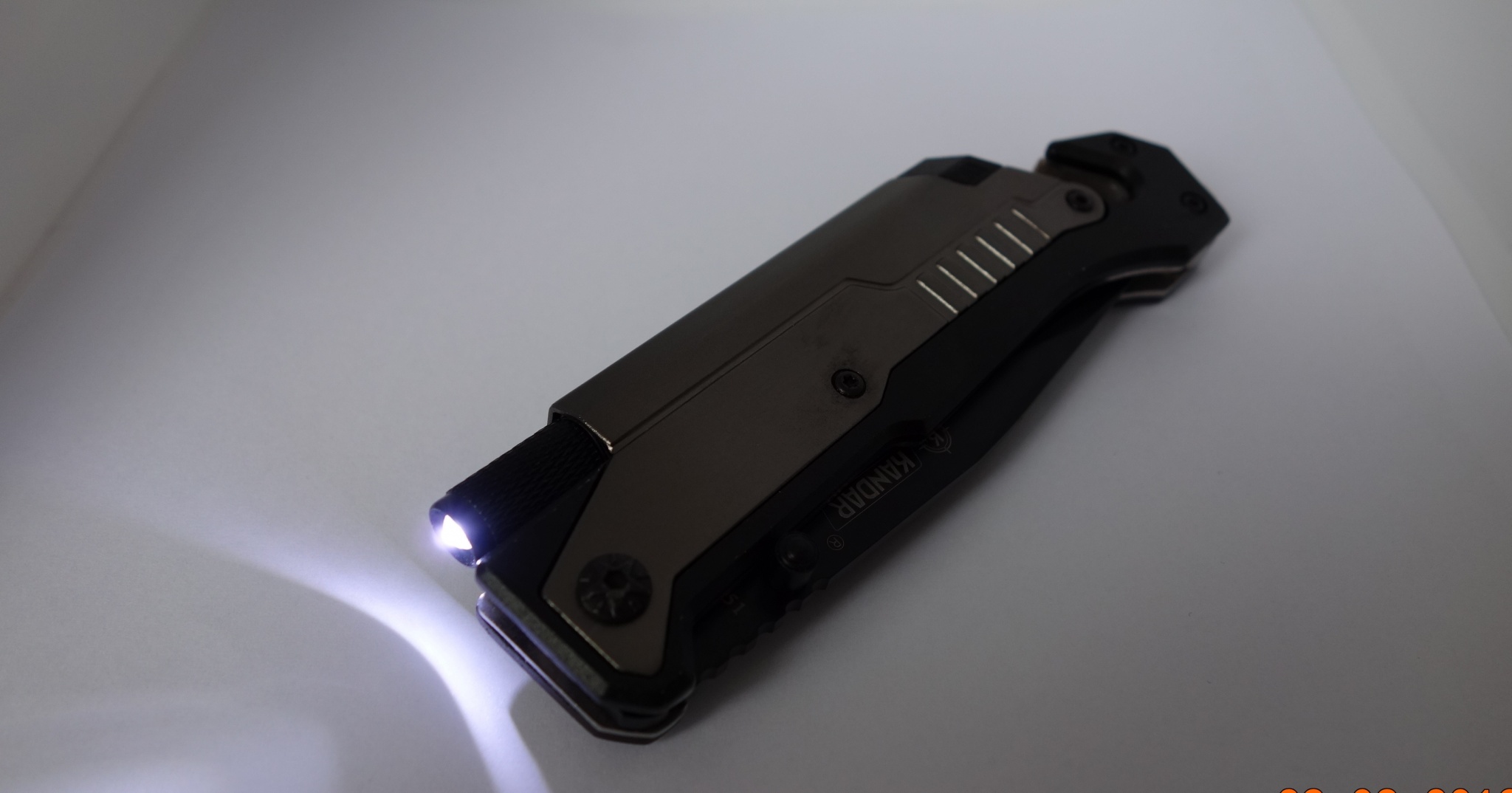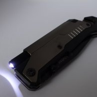 Wyjmowana wodoodporna latarka znajduje się w tzw. grzbiecie rękojeści. Reflektor skierowany jest wzdłuż grzbietu ostrza.